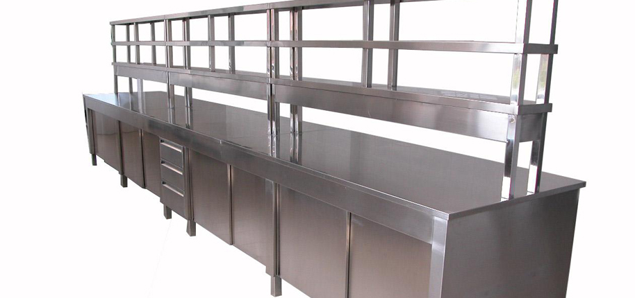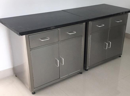 不銹鋼臺面:采用S304不銹鋼四邊折彎內襯18-25MM夾板制作(刨花板、中纖板、實芯理化板、環(huán)氧樹脂板、千思板、陶瓷板等臺面,根據(jù)客戶需求提供);